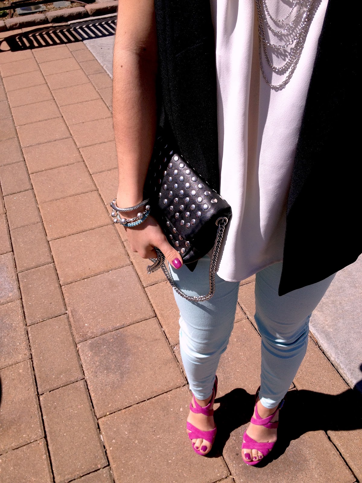 El look de hoy se basa en mezclar colores sólidos. Empecé con estas sandalias, y luego decidí combinarlas con estos pantalones color azul cielo. Esta mezcla de colores me encanta y para darle un toque particular al outift acompañe el rosado y el azul con este chaleco negro que es ultra versátil y un top blanco para balancear todo el look. Espero que estos tips les sirva a la hora de combinar colores!