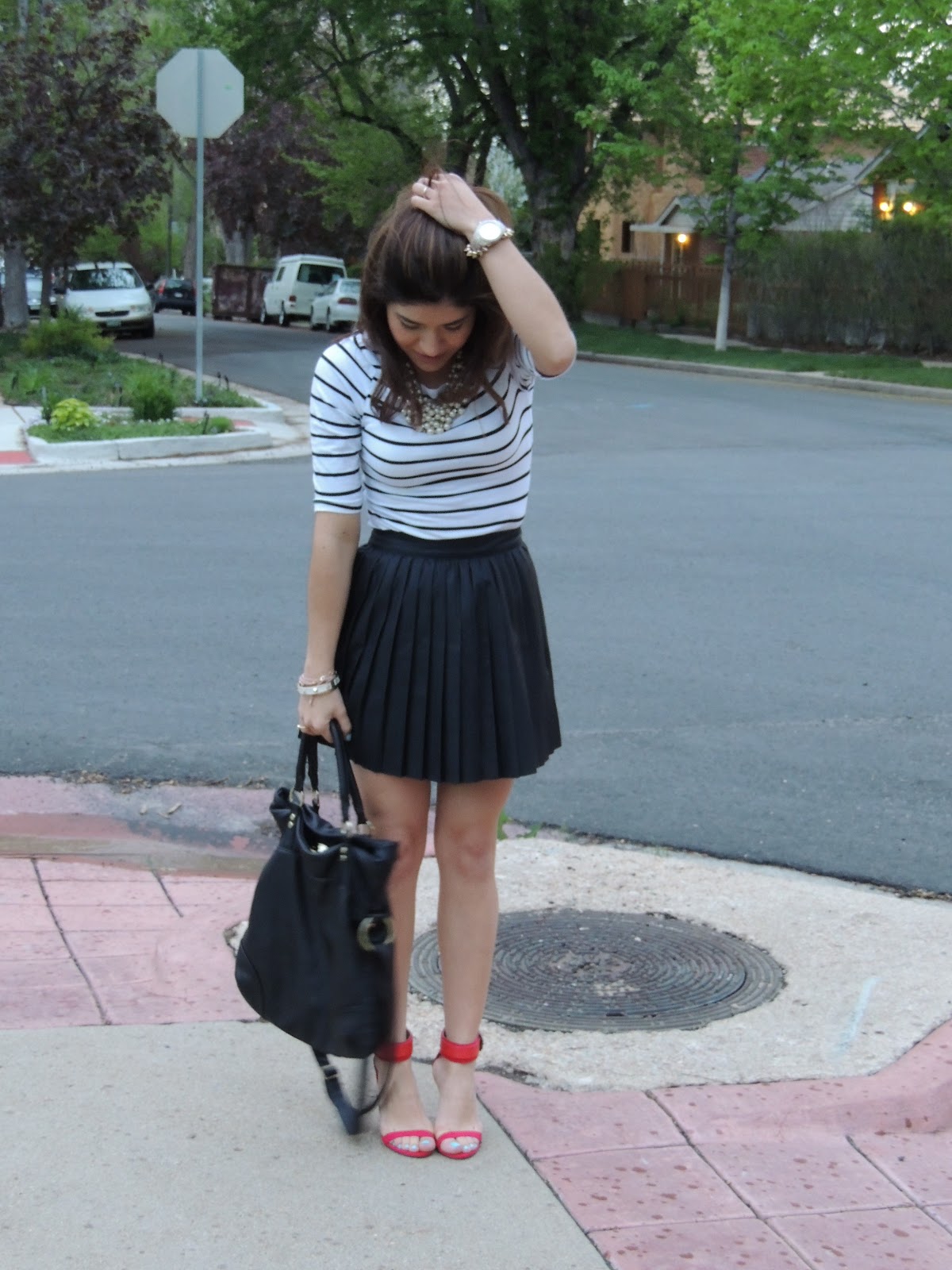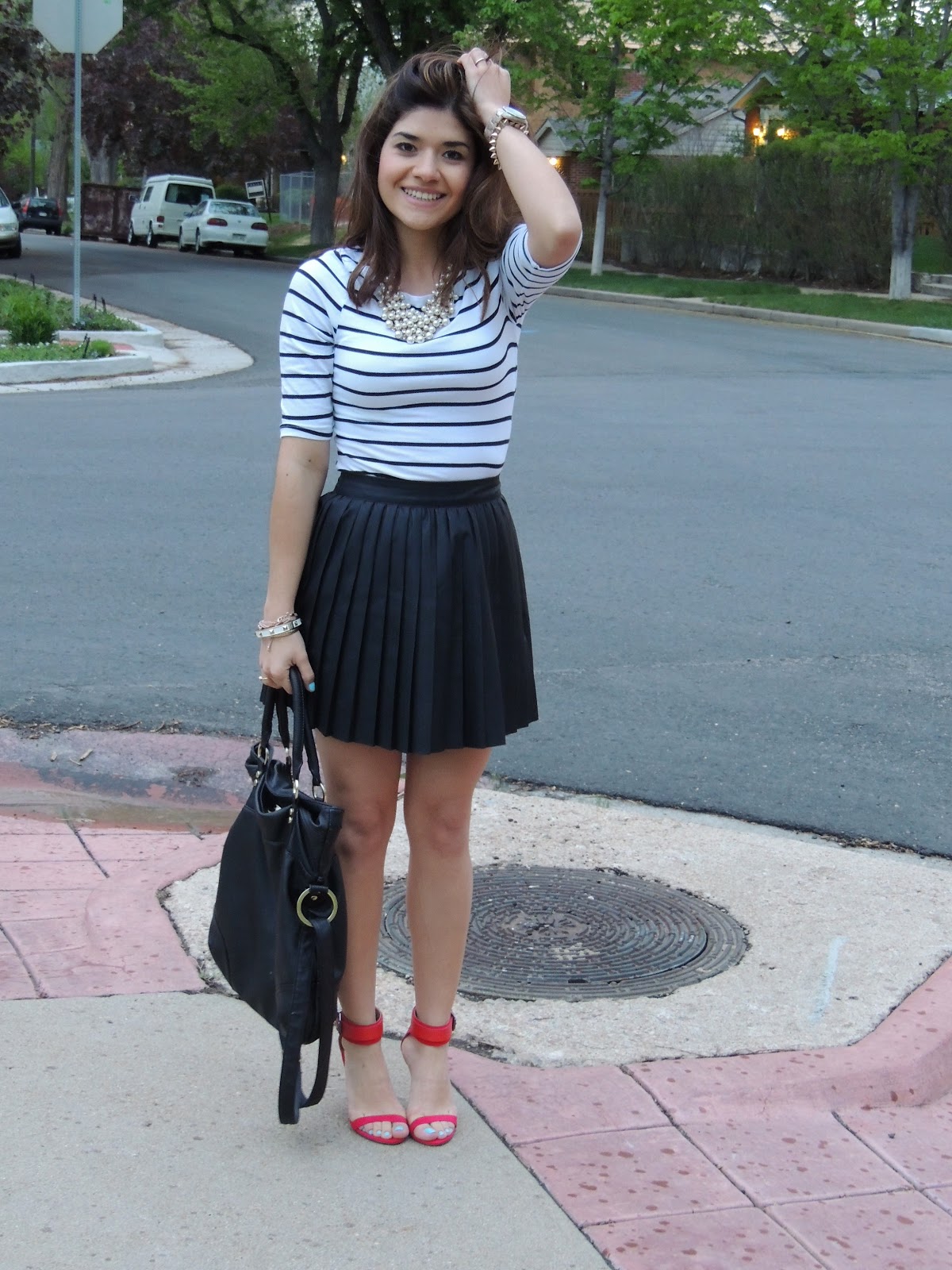 La tendencia blanco y negro es definitivamente mi favorita de la temporada, pero por algún motivo, cada vez que quiero ponerme algo completamente blanco o negro, siempre termino añadiendo algo de color. Y eso fue lo que exactamente me paso con este outfit. Inicialmente queria que fuera monocromático, pero las sandalias rojas y el top de rayas, termino dandole un toque marinero. Lo cuál me gusto mucho, y para sentirme aún más femenina, agregue el collar de perlas. Estas sandalias rojas fueron una gran inversión, y me he dado cuenta que les puedo dar más uso de lo que pensaba, así que las estarán viendo bastante aquí en el blog 🙂