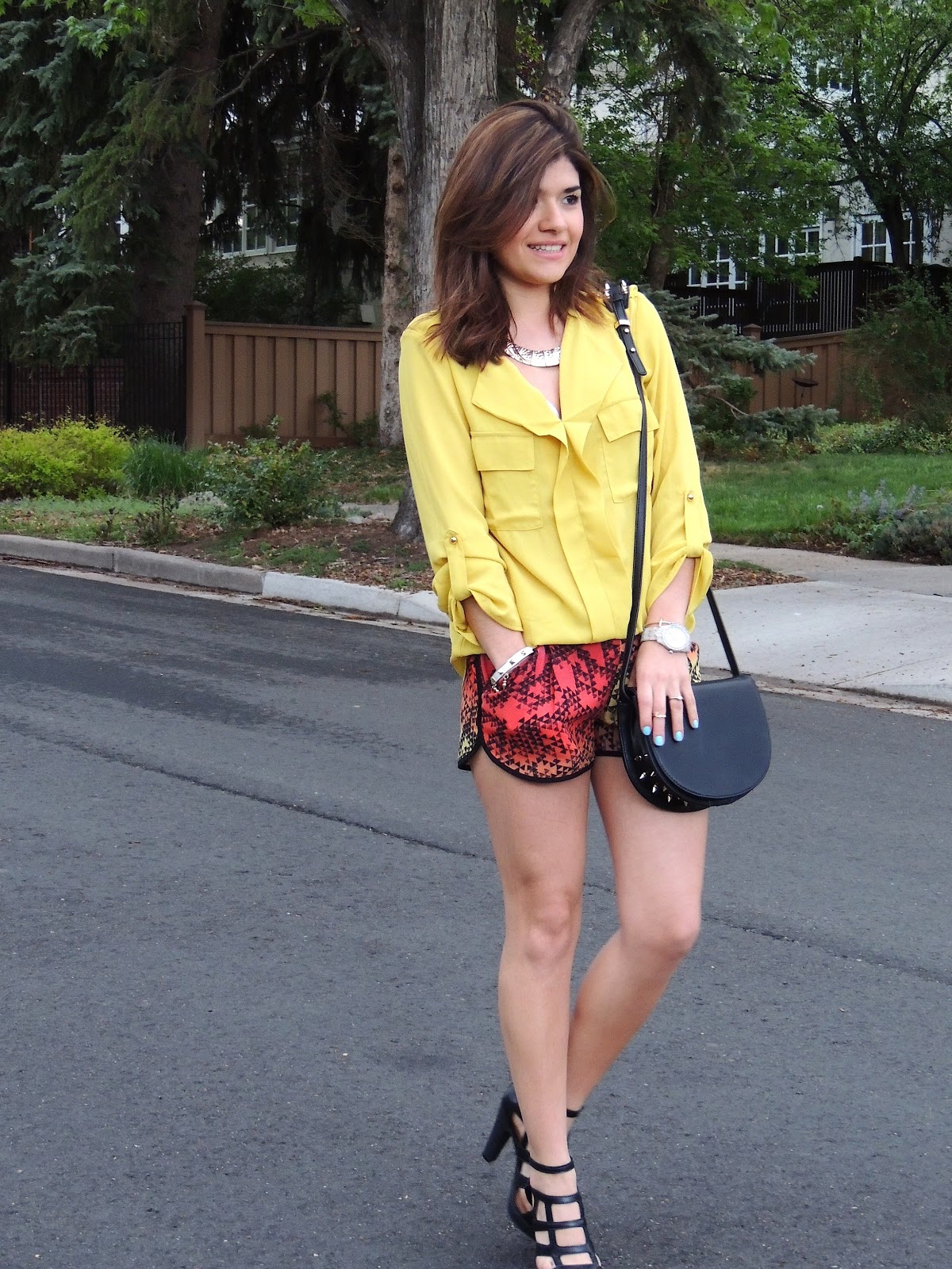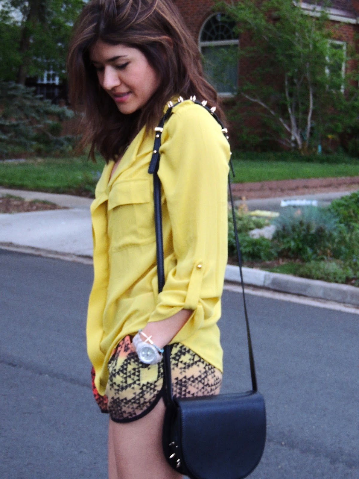 Desde ya hace bastante tiempo he venido buscando unos shorts de corte deportivo y por fin los encontre. Cuando los vi me enamore de inmediato, y la mejor parte no fue encontrarlos, si no el precio! Tan solo me contaron $10 en Urban Outfitters. El fin de semana pasado tenían ofertas y como siempre tuve que pasar a chismosiar! Ultimamente he estado tratando de comprar cosas, pero con estos precios, quien se puede resistir! Pero bueno, hablamos del outfit. Lo que más me gusto de estos shorts, fue el estampado y la tela. Como han podido ver, me encanta el chiffon y las prendas sueltas, y para el top de este look no pude pensar en otra mejor opción. Para terminar opté por un collar sencillo dorado, sandalias y bolso negros para neutralizar un poco el juego de colores.