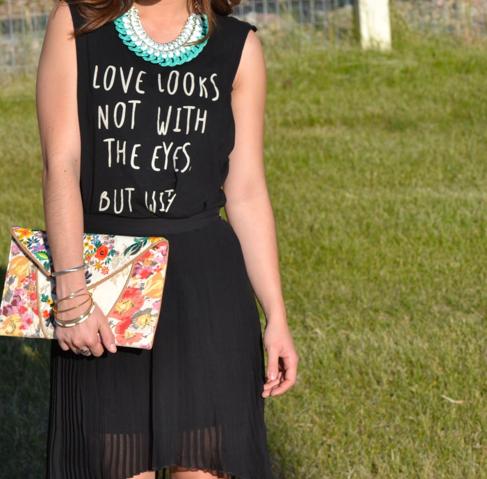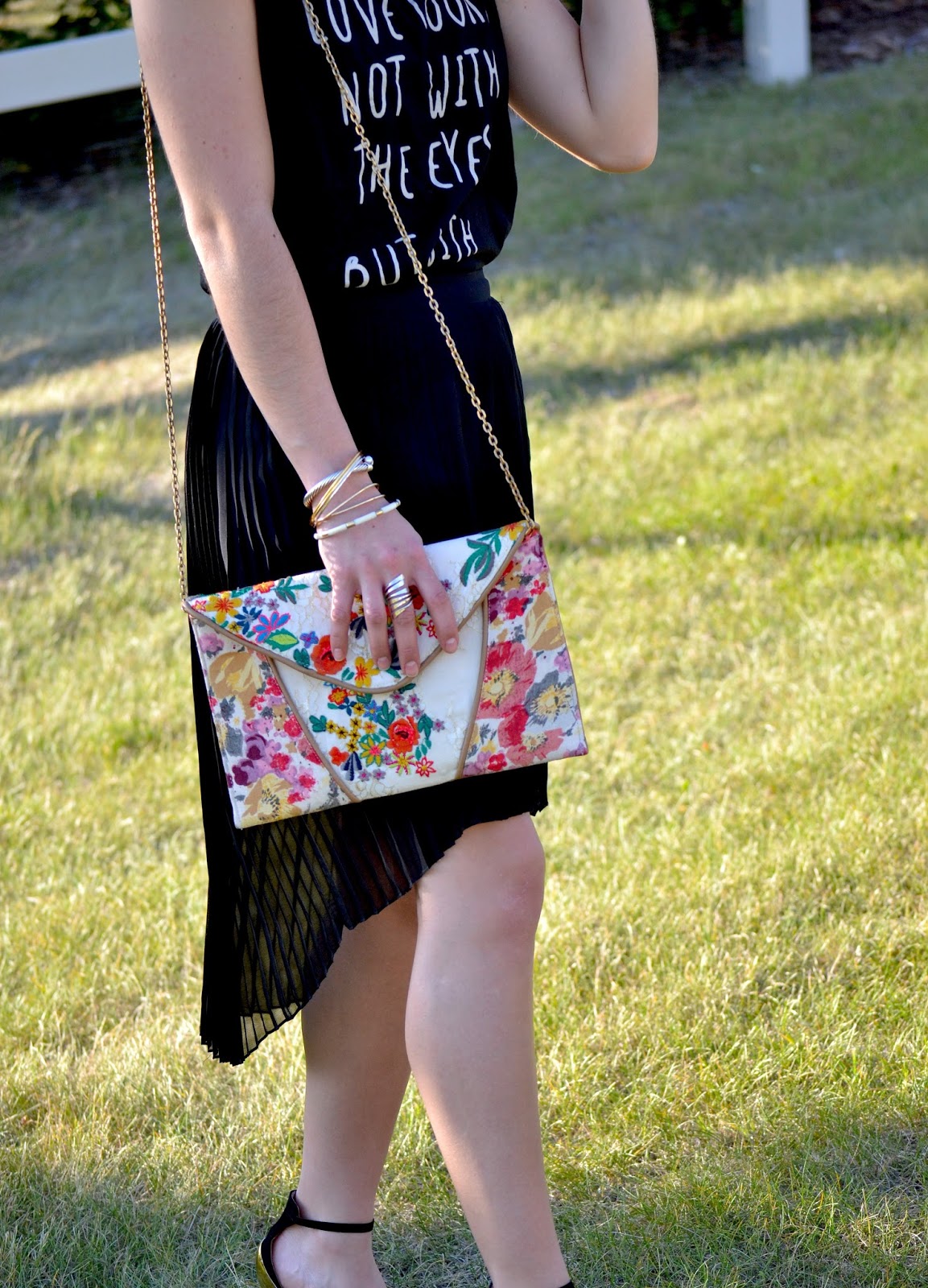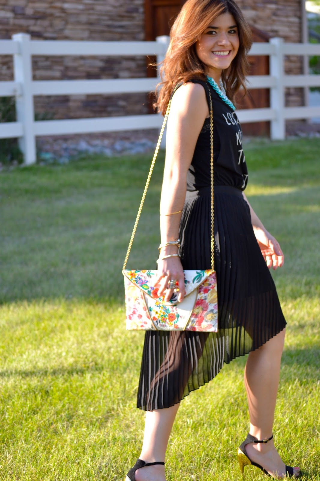 Como ya les había contado anteriormente, compartir looks a diario es lo que busco hacer por medio del blog. Vestirme y armar diferentes outfits todos los días es mi deporte favorito y compartir los resultados por medio de las fotos que subo se ha convertido en una de mis grandes pasiones. Es bastante peculiar ver como todos tenemos intereses diferentes, y el mío es la moda. Aunque a simple vista es algo que muchos consideran superficial, por que en si lo es, ya que es lo primero que vemos en las personas, Para mi, tanto como para muchos es un tema de mucha sensibilidad y lo miro como algo que va más allá de eso. Es por esto que siempre estoy prestando atención a los pequeños detalles, y cosas tan simples como la forma en que la gente se viste disfruto demasiado, y espero que lo que he estado compartiendo en este espacio los inspire a disfrutar todo esto tanto como yo. Volviendo al tema del los looks para todos los días, el de hoy es casi todo negro, si no fuera por los accesorios. Esta cartera tipo sobre de flores me encanto desde el primer momento en que lo vi, y el negro ayudo mucho a que resaltara. Las camisetas son un básico que nunca pueden faltar en el closet de nadie, especialmente con las temperaturas de este momento y esta le dio un toque menos sobrio a la falda negra plisada de seda.