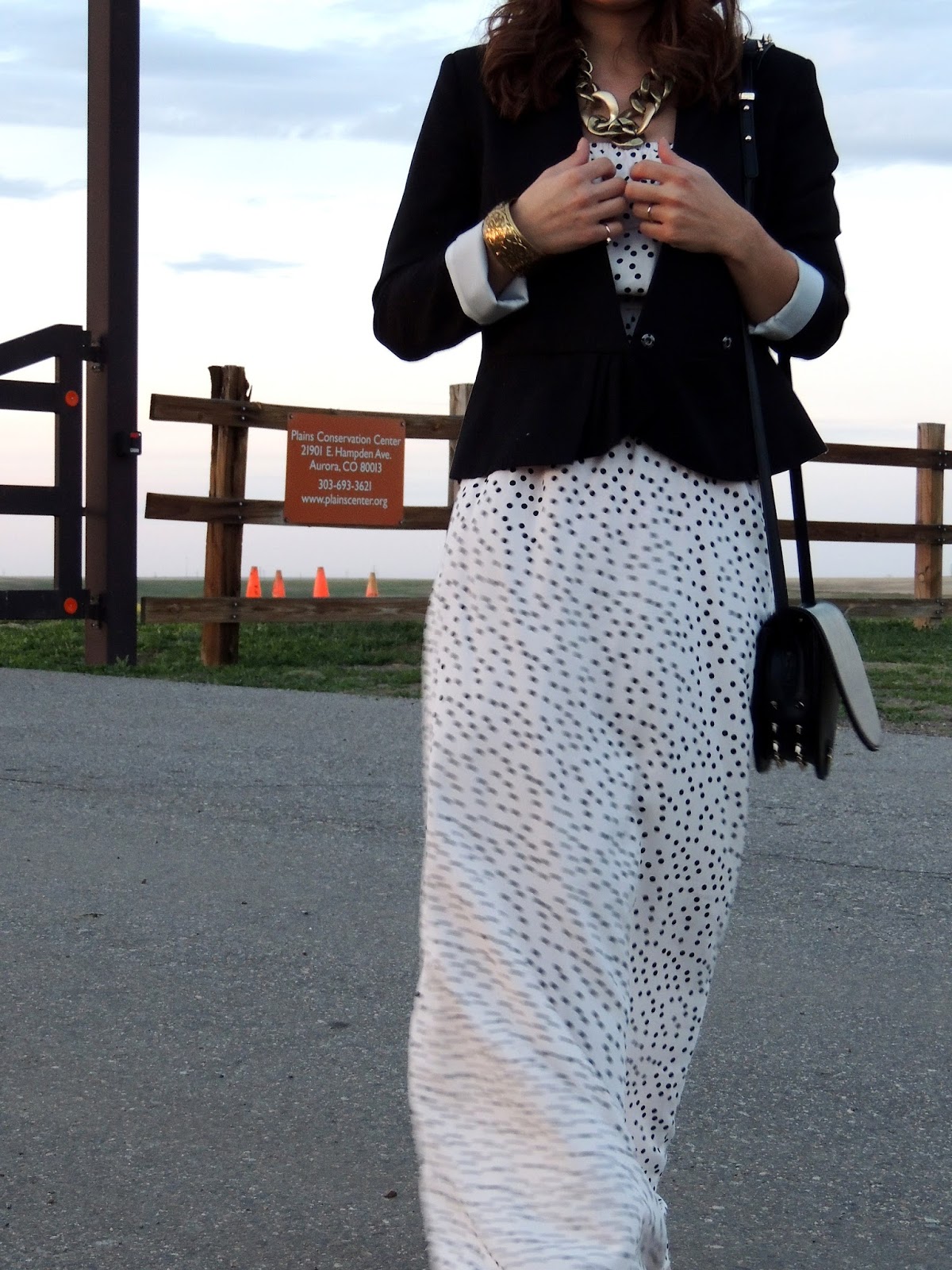 Los maxi vestidos han estado y seguirán en furor. Ya han sido varias temporadas desde que salieron al mercado y no han dejado de ser recreados. Son una de las piezas favoritas por mucha gente para llevar durante esta temporada de calor del año, y son muy fáciles de llevar con diferentes prendas. Hoy les quiero compartir este outfit que me puse hace varias semanas. Debo confesar que por aquello de la estatura a mi me cuenta encontrar este tipo de prendas. Aunque es un arreglo bastante fácil de hacer, prefiero comprarlos a mi medida, y es por esto que cuando vi este vestido, no dude en adquirirlo! El largo era perfecto y el estampado me encanto. En estas fotos pueden ver como lo llevo con un blazer negro y accesorios dorados. Llevar este vestido del día a la noche no es nada complicado, y si has querido ponerte tu maxi vestido favorito de una forma diferente, te recomiendo acompañarlo con un blazer de corte ceñido y que no llegue más abajo de tu cadera, ya que alargara tu silueta. Acompañalo con accesorios grandes para un look más llamativo!