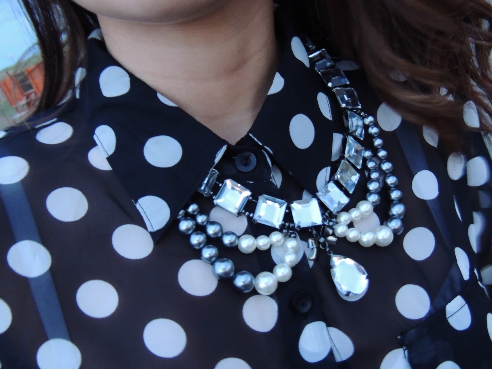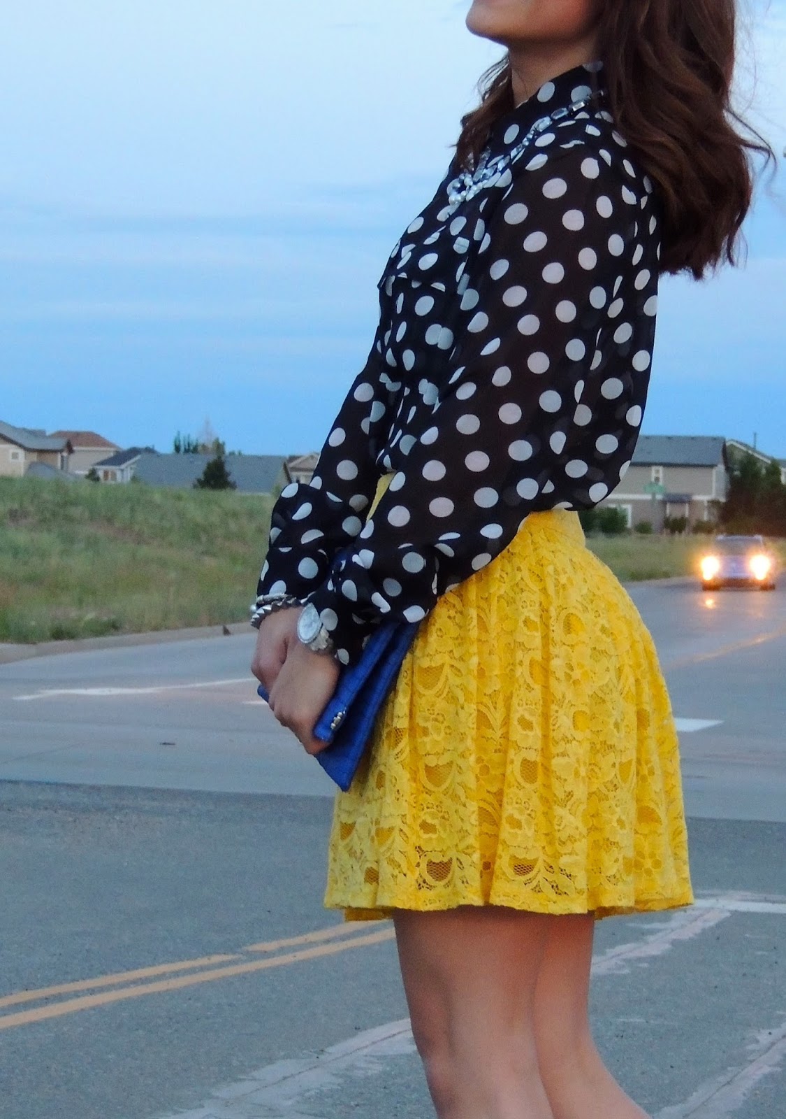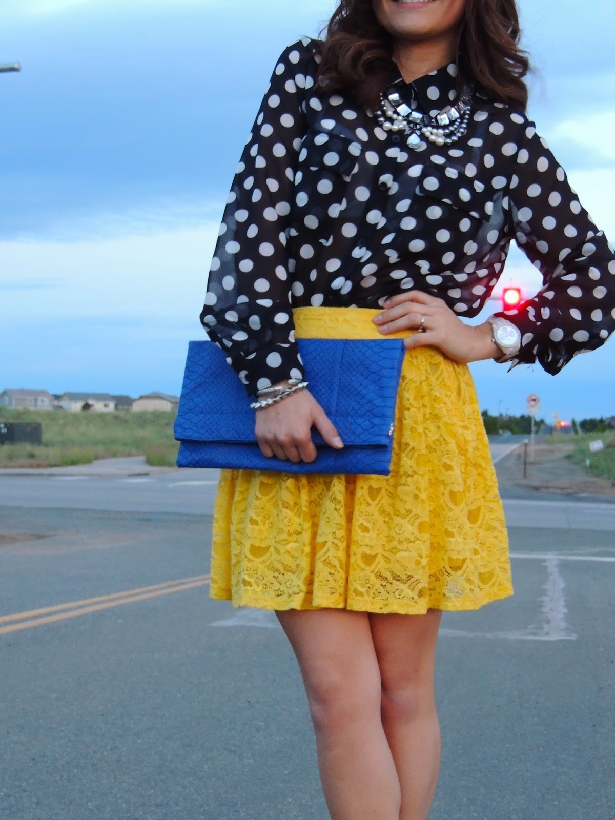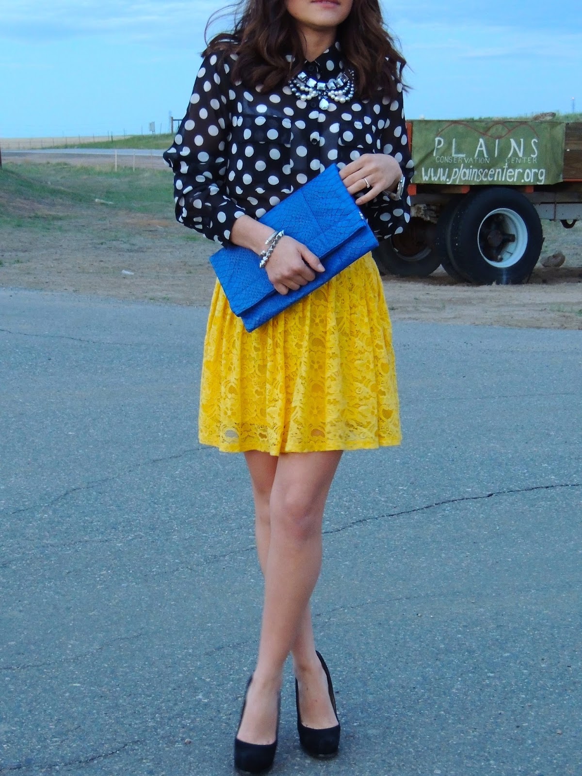 Hoy lunes, comencemos semana con mucho color. Este look que hoy les comparto es bastante femenino y llamativo por el amarillo de la falda y el azul de bolso tipo sobre, pero me encanta ya que son combinaciones que no hago muy seguido, pero cuando las hago trato de disfrutarlas al máximo. El estampado de puntos es un clásico que nunca pasará de moda, y siempre va a ser de mis favoritos. Entre más grandes los puntos, mejor! Recuerdo que mi abuelita tenia una camisa igual a esta, que acostumbraba acompañar con collares de perlas y siempre me fascinaba como se veía. Definitivamente a ella le debo mi obsesión por los puntos. Su estilo sin duda repercutió en el mío, principalmente en mi amor por las prendas de chiffon.