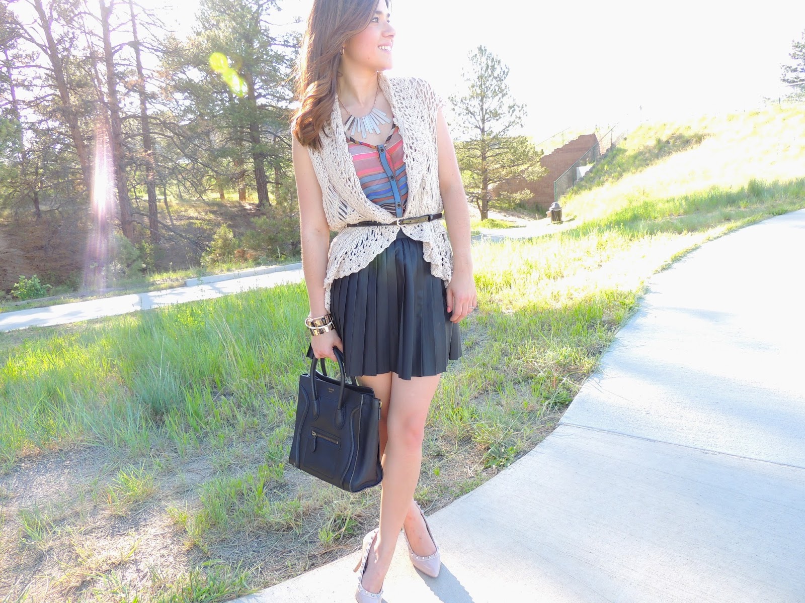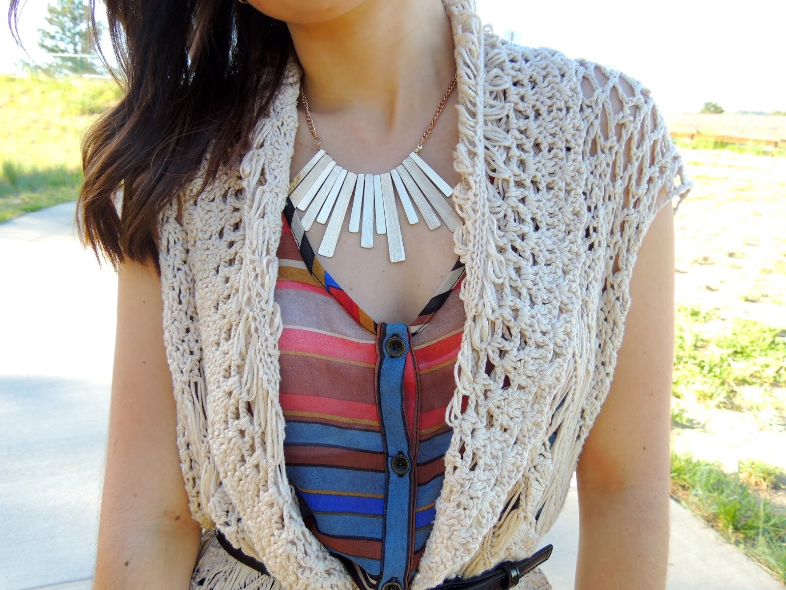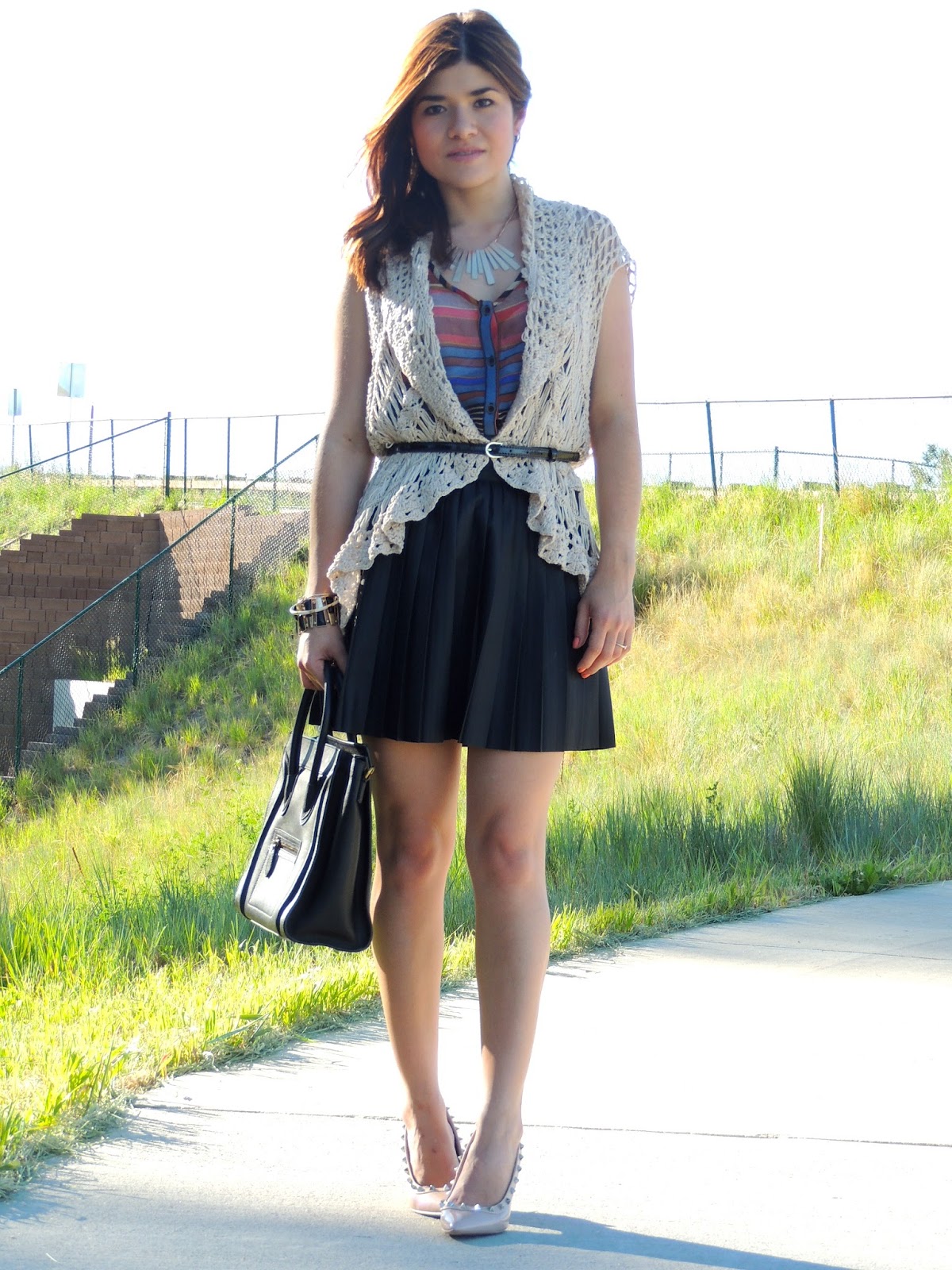 El toque extra de color, se lo agregué con este top de rayas de chiffon que tengo desde hace bastante tiempo, es tan lindo que no lo he querido sacar de mi closet y el chaleco de crochet ya también lo tengo hace varios años, pero siempre me lo ponia con jeans y esqueletos negros ó beige. Es por esto que me pareció perfecto sacarlo del closet y llevarlo de una forma completamente diferente.