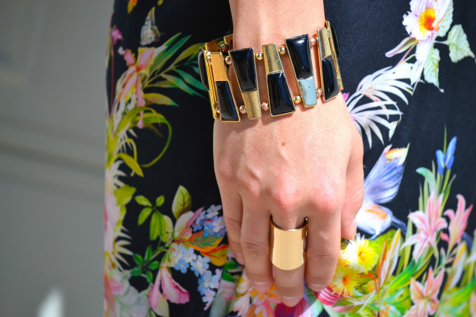 For the accessories I picked a gold bracelet with black accents, a clean cut ring, and yellow neón sandals to add a fun contrast with the pants.