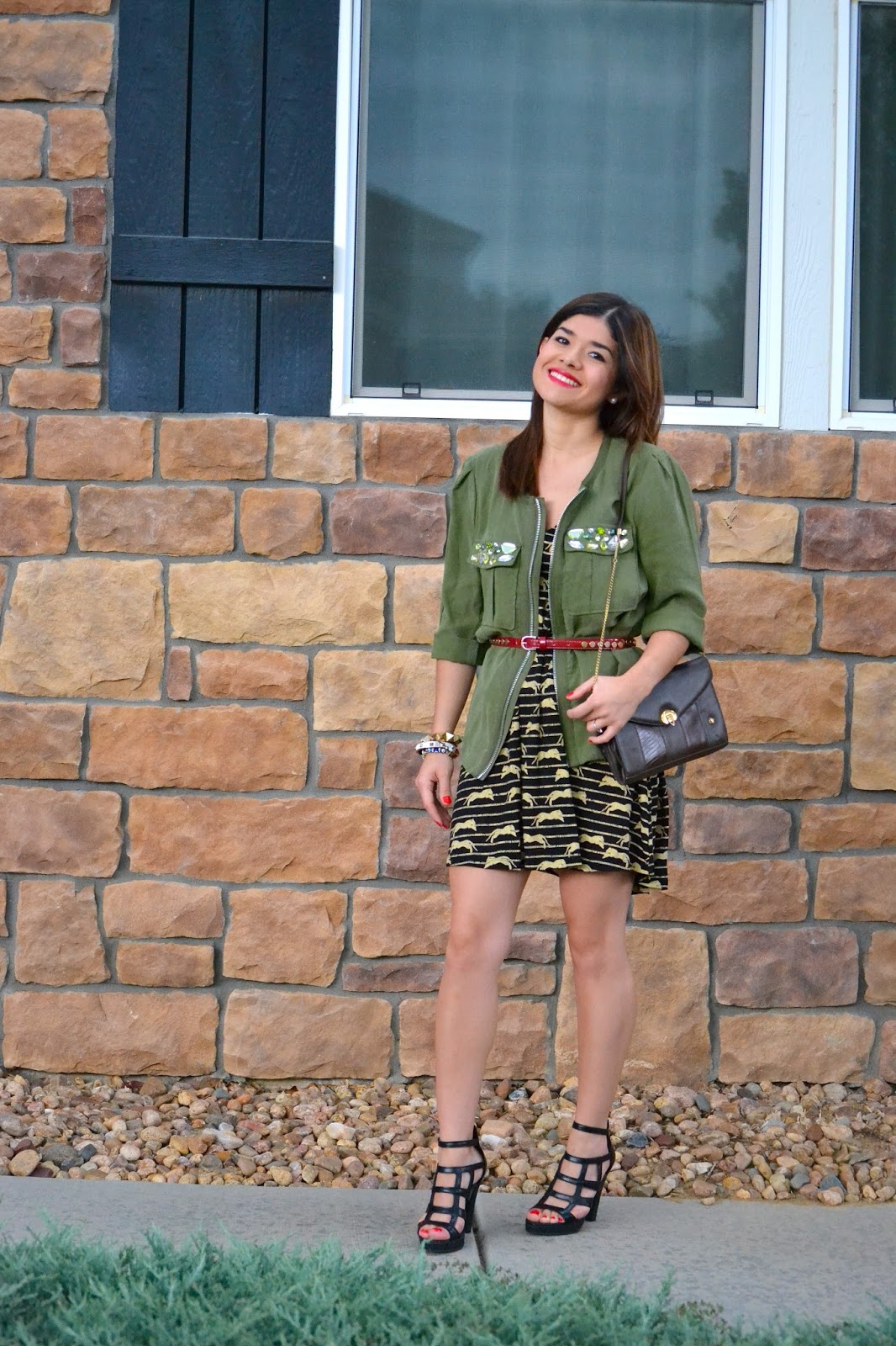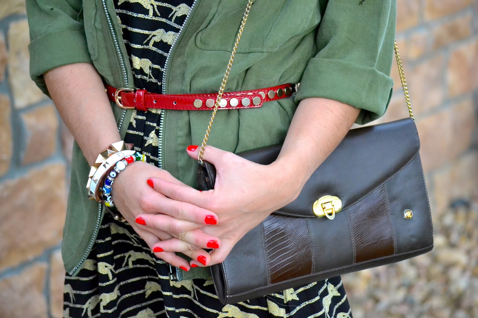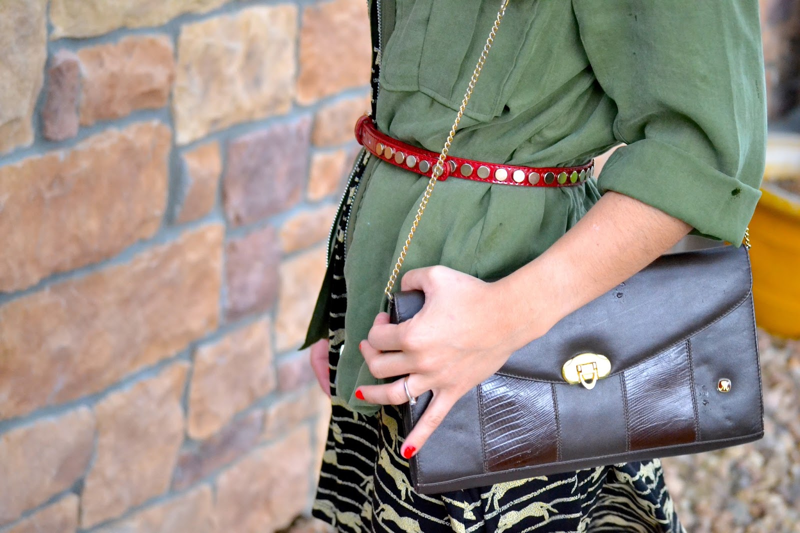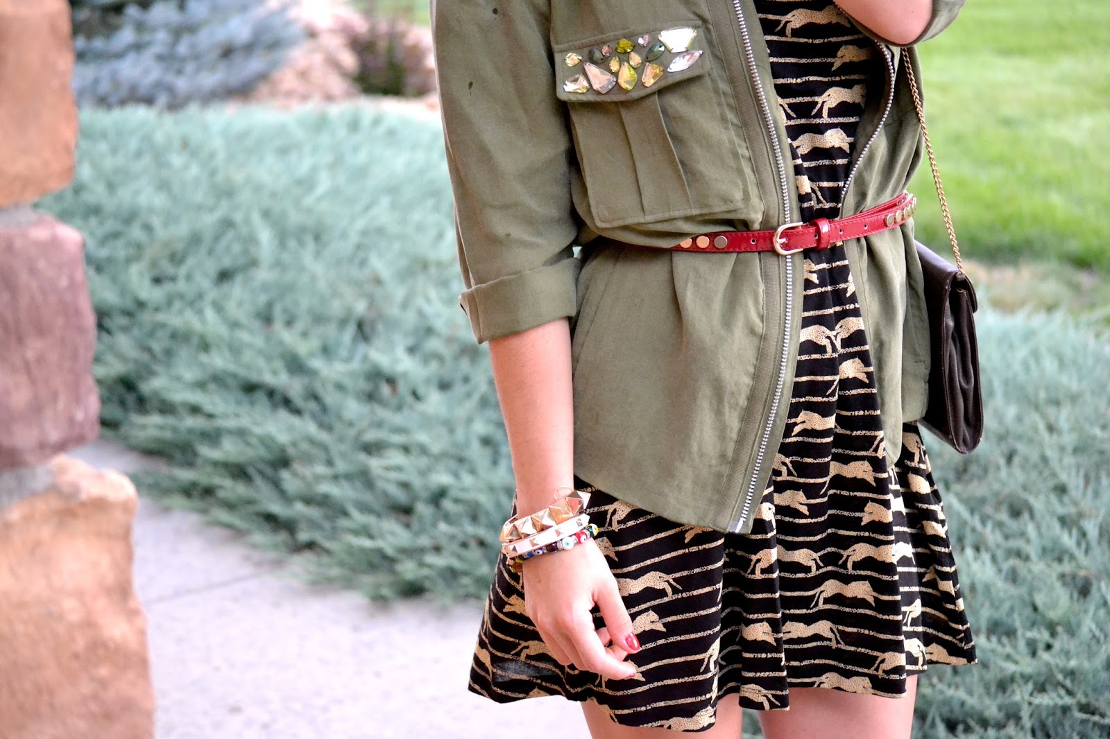 The dress I´m wearing here caught my attention once I saw it, the print, and the gold detailing were pretty interesting plus it paired perfectly with my military inspired jacket that I got from their past conscious collection. To give the outfit a different touch of color, I decided to add this red studded skinny belt, and wore this gorgeous vintage bag that I got from my grandma.