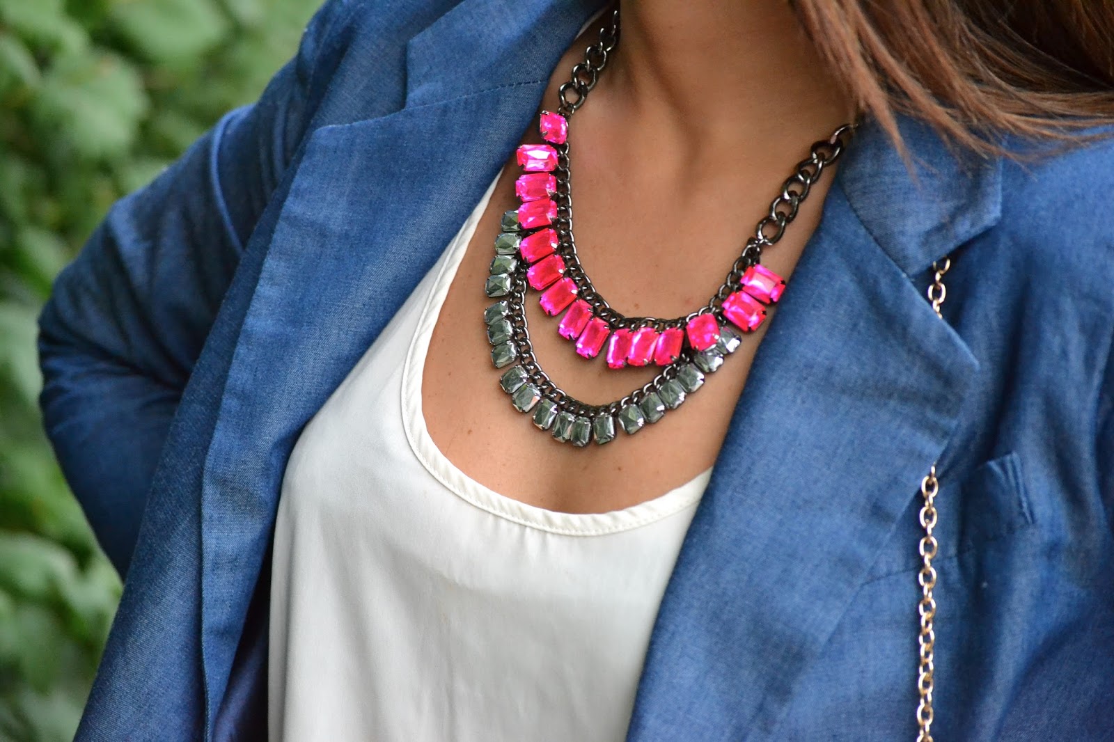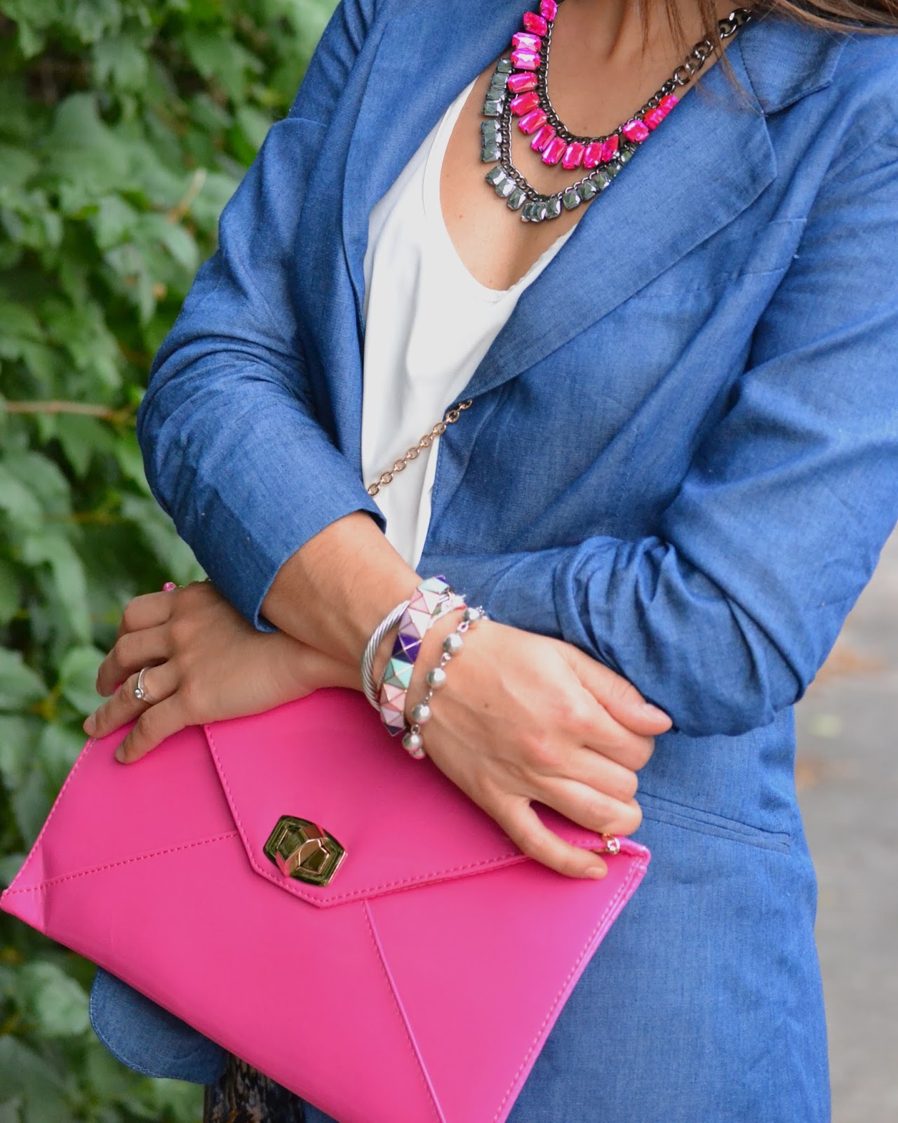 Como la pinta estaba muy azul, decidí agregar algo de color, así que escogí accesorios rosados para crear contraste con el estampado de culebra de los pantalones.