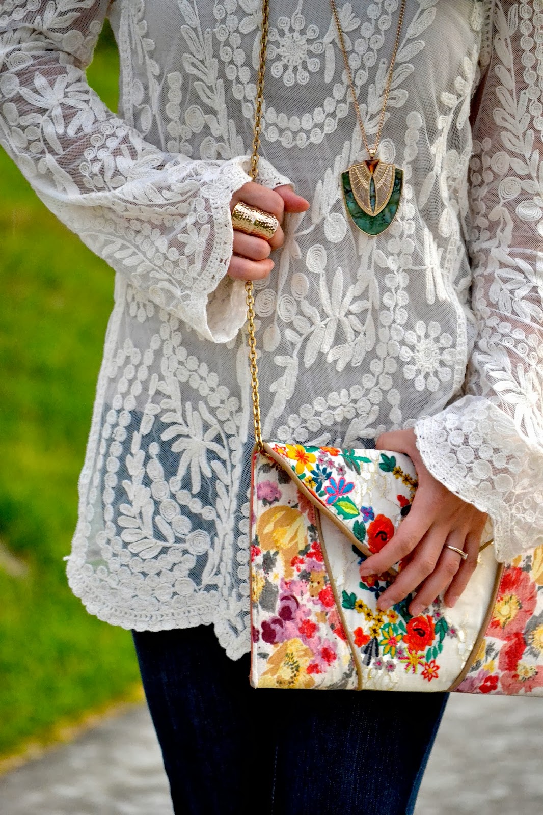 Los detalles que tiene fueron más que suficiente para dejar que el top fuera el punto de enfoque del look, agregué accesorios sencillos, como el collar largo y el bolso de mano de flores para añadir más color. Aproveche para volver a usar unos de mis pantalones bota ancha, ya tenía mucho sin usar un para así. Se me olvidaba los bueno que son para alargar las piernas!