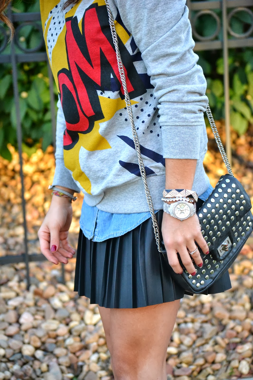 Para el outfit opté por combinar el sweater con una camisa de jean, y falda de cuero sintético. Las sandalias rojas fueron una buena opción pues añadieron más color.