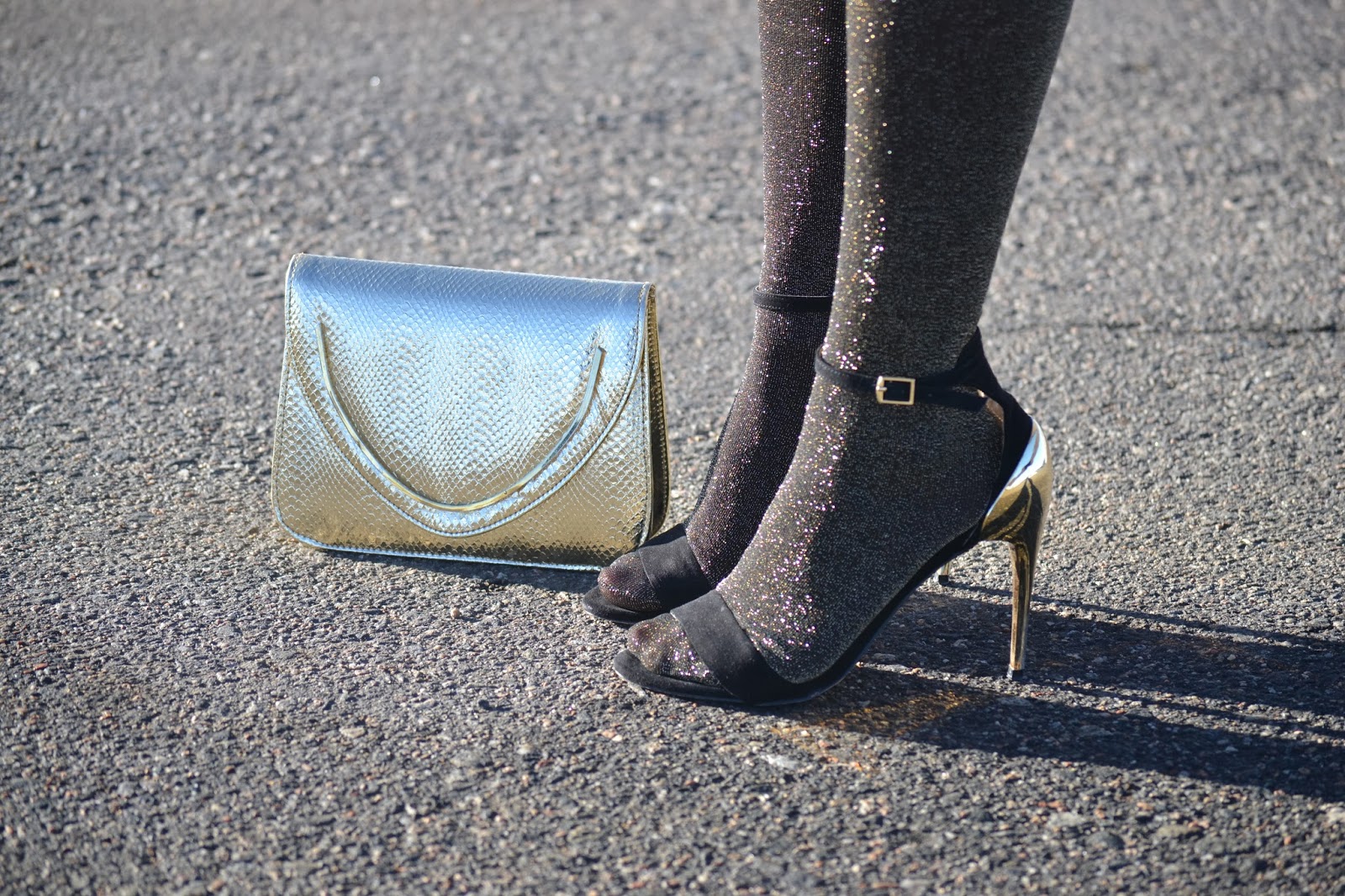 Los acentos dorados, me gustaron bastante y ayudaron a darle un toque muy inesperado al outfit, pues como pueden llevar llevo medias veladas con sandalias.