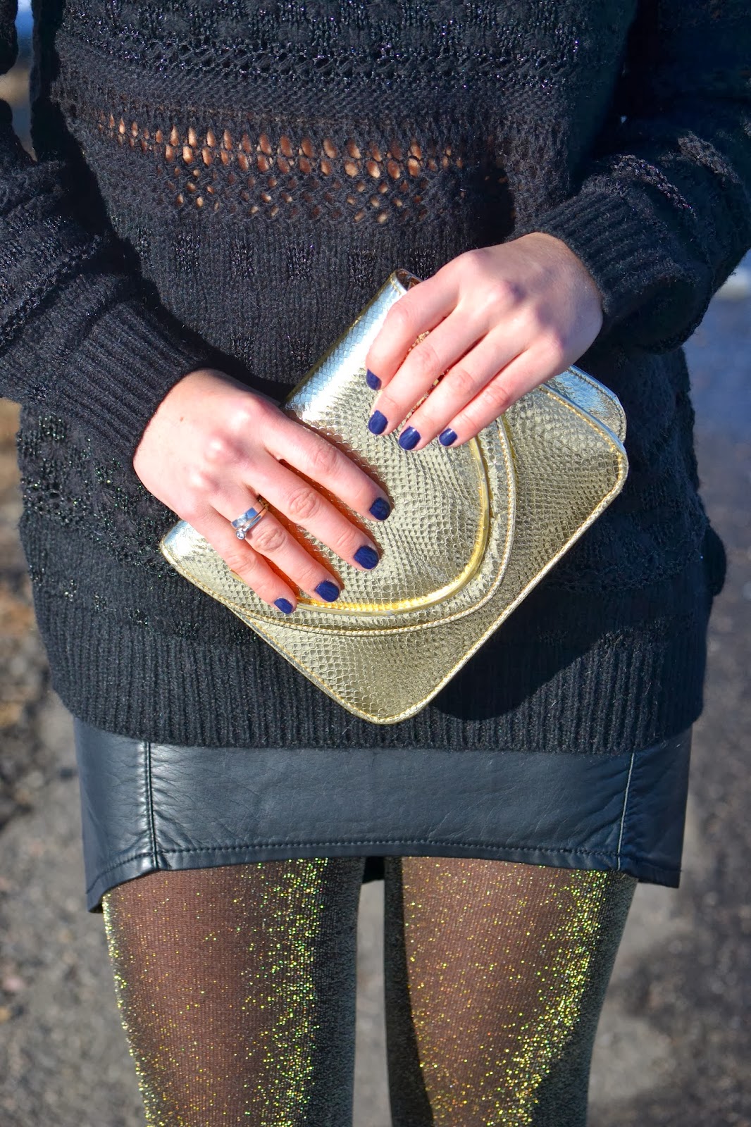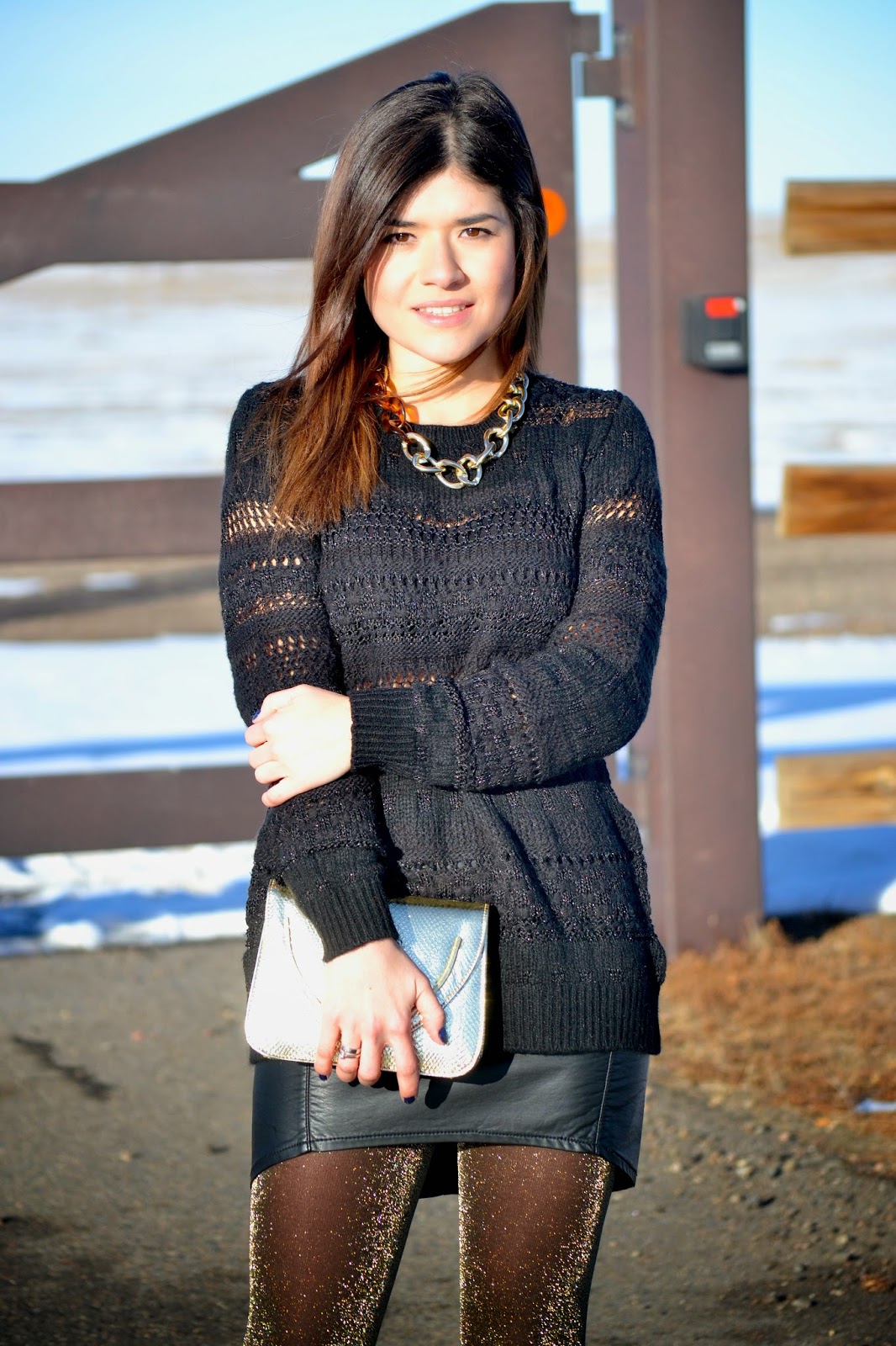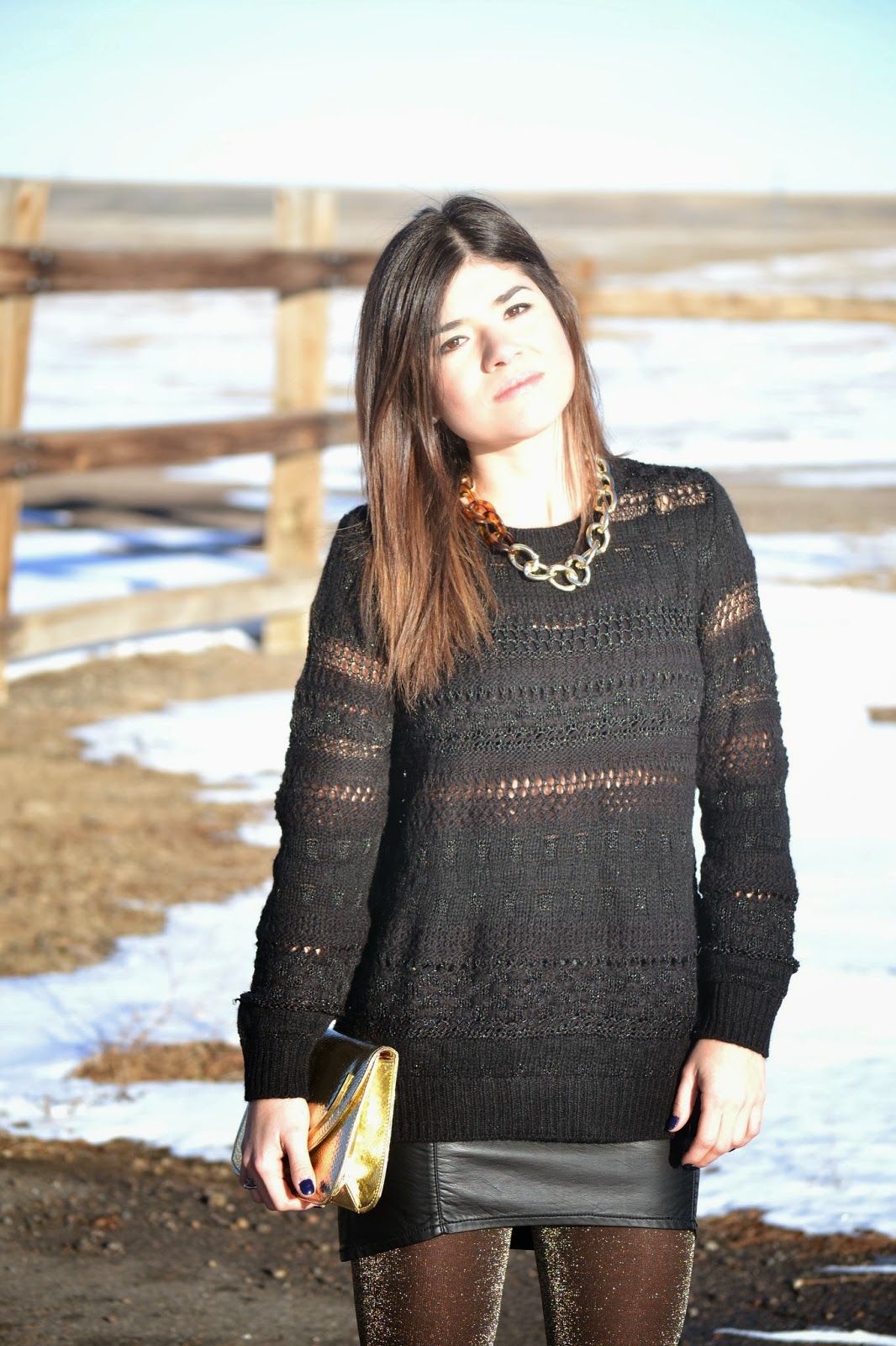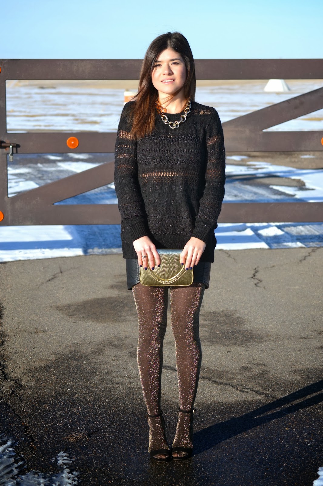 Escogí el dorado para los accesorios ya que las medias veladas tienen aplicaciones de hilos en este mismo tono. Para finalizar agregue un collar grueso tipo cadena y nada más.